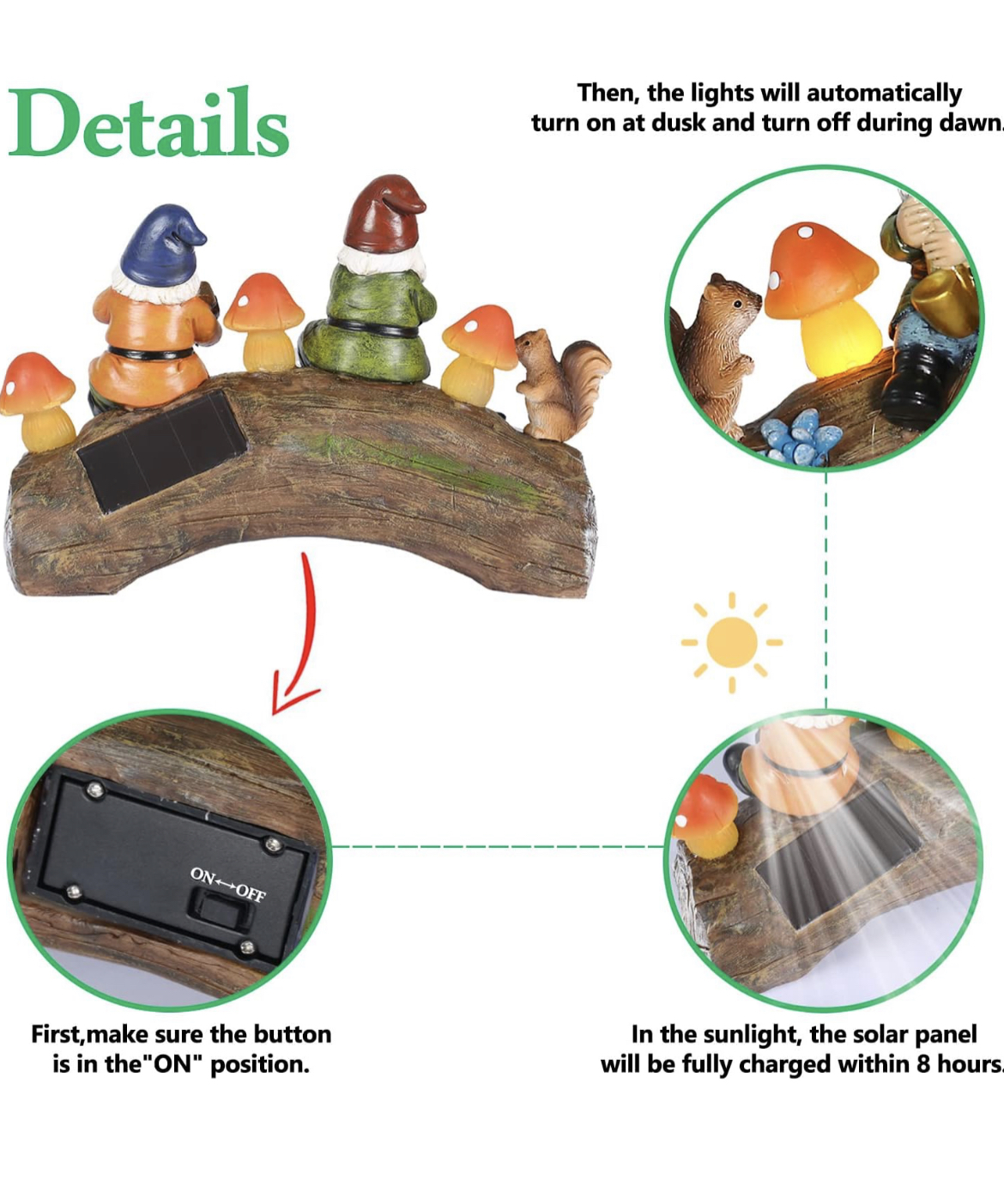 Garden gnome statues Resin Squirrel gnomes Figurine Solar Led Mushroom lights on log , Outdoor spring Decorations